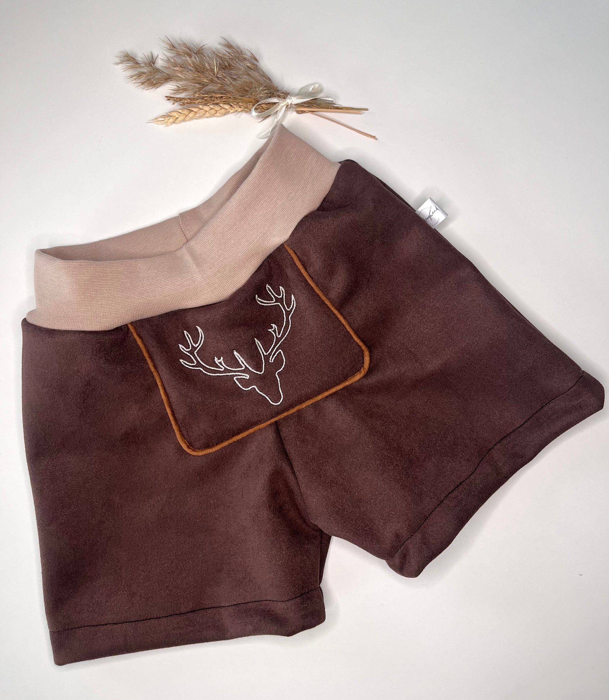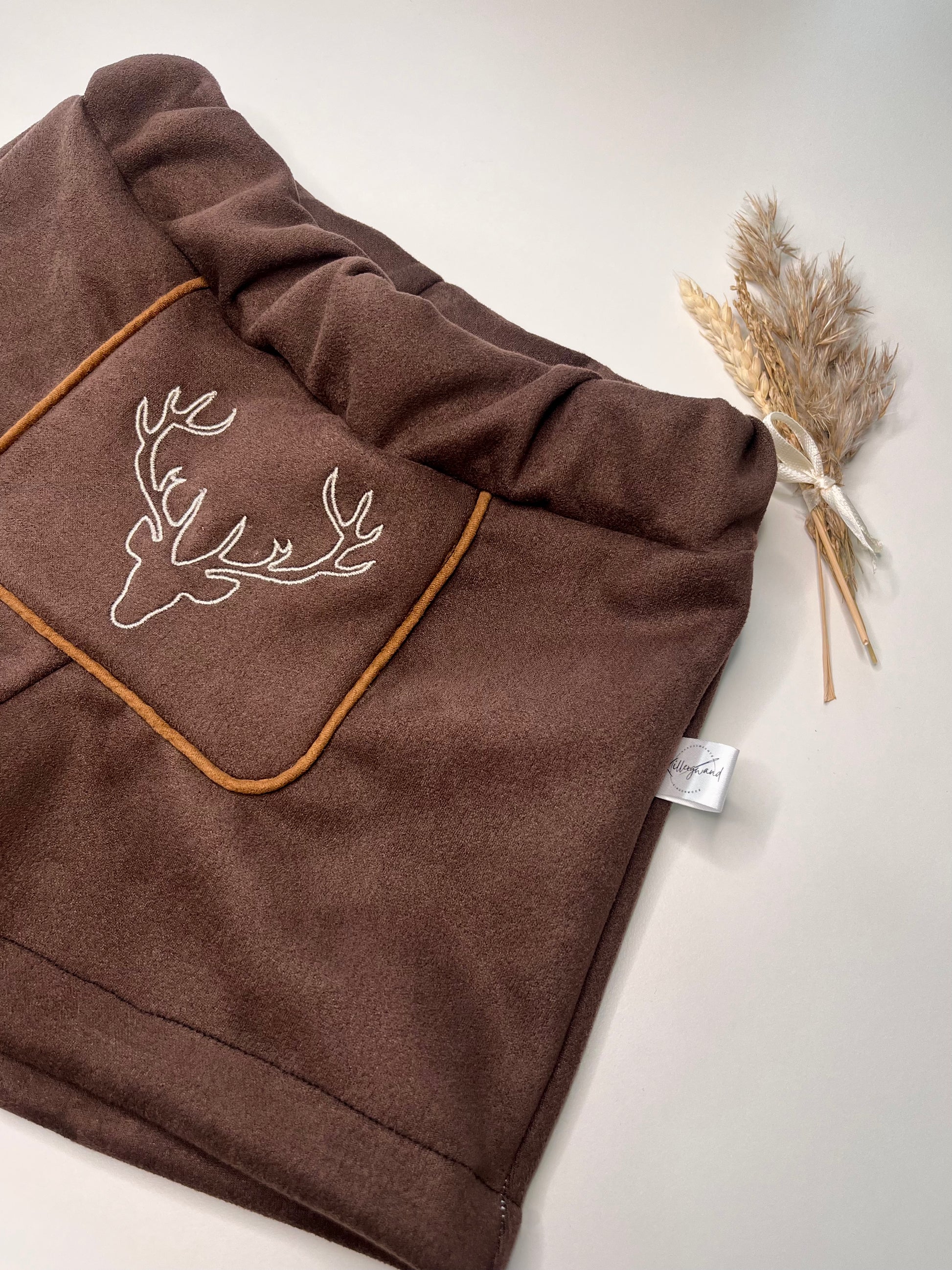 Die Hose besteht aus elastischem Velourlederjersey. Dieses Kunstleder fühlt sich wunderbar weich an und ist sehr angenehm zu tragen. Wahlweise könnt ihr die Hose mit Bündchen oder Gummizug am Bund erhalten.